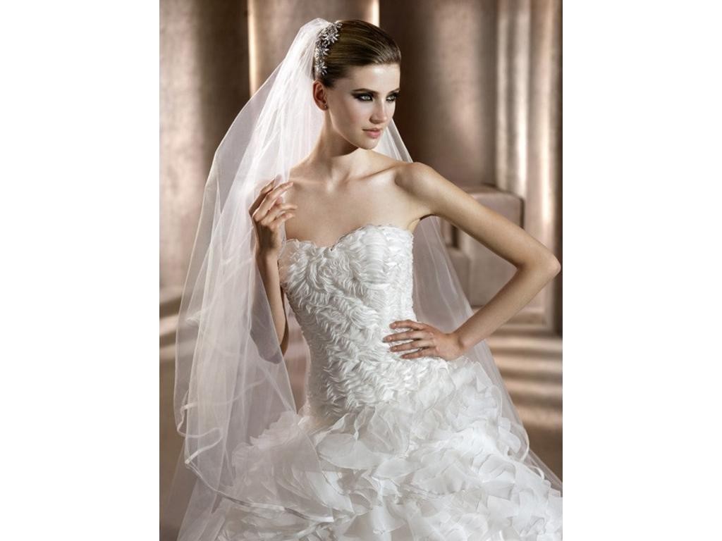 Blanca est une robe de mariée de la marque pronovias. Elle est confectionnée avec une superposition de volants meme sur le bustier. Cela lui donne un effet angelique.