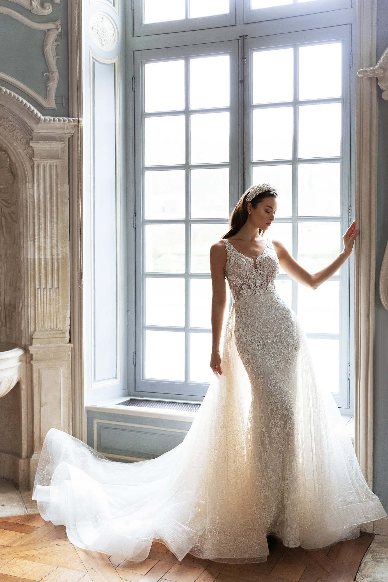 Ornée de petites fleurs, de perles et de dentelle, cette robe de mariée soulignera vos courbes et mettra en valeur votre silhouette.