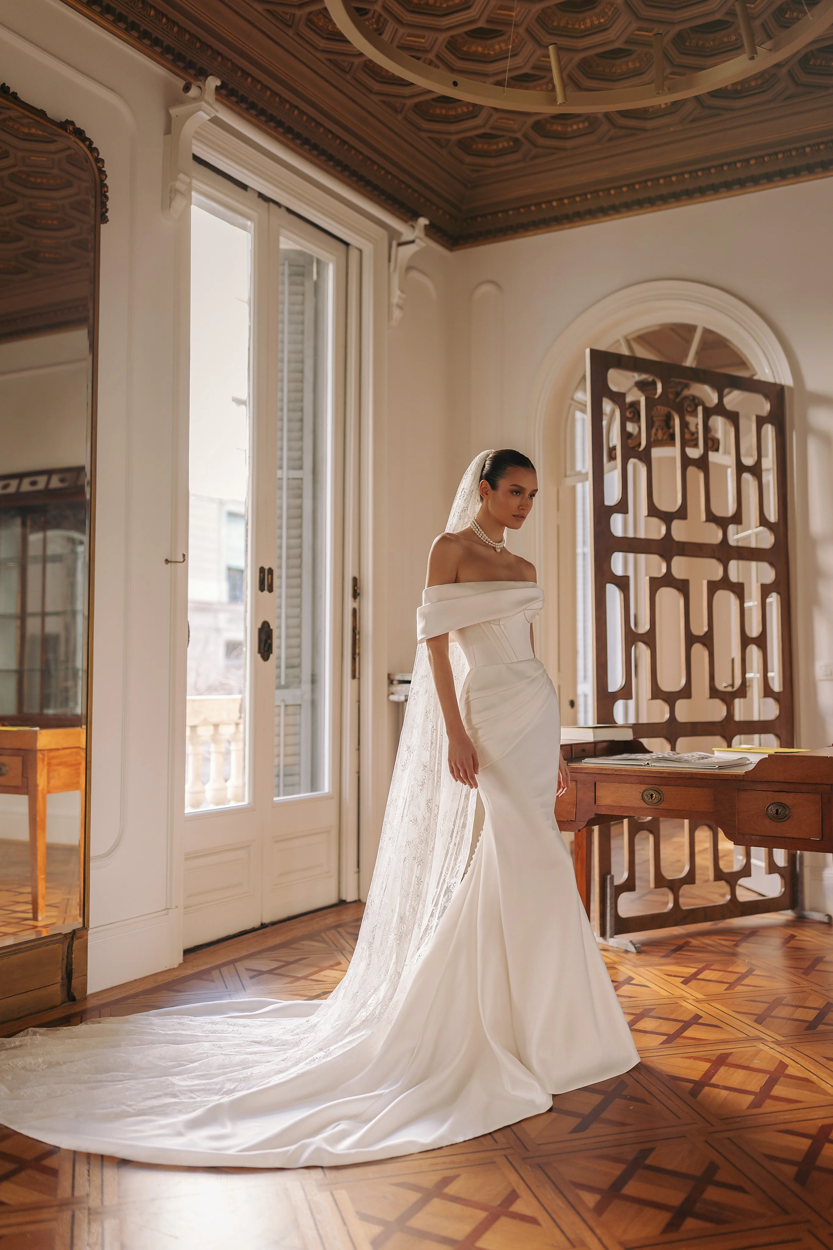 Découvrez l'élégance absolue avec notre robe de mariée Vérona , robe sirène en mikado, sublimée par une encolure bateau , un drapé délicat et un corset aux coutures apparentes. Cette pièce haute couture épousera vos courbes avec perfection. Une ligne de boutons parcours élégamment la traine , ajoutant une touche de raffinement.
