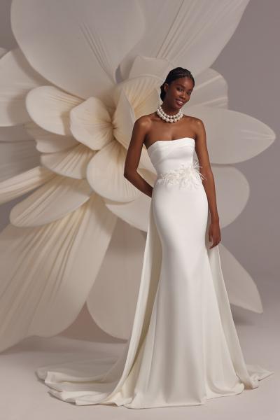 Le modele Amalfy est une robe fourreau en crèpe , l'encolure est droite mais l'effet asymétrique du drapé met en valeur le decollété. La surjupe est amovible avec une ceinture florale ornée de véritable plumes.