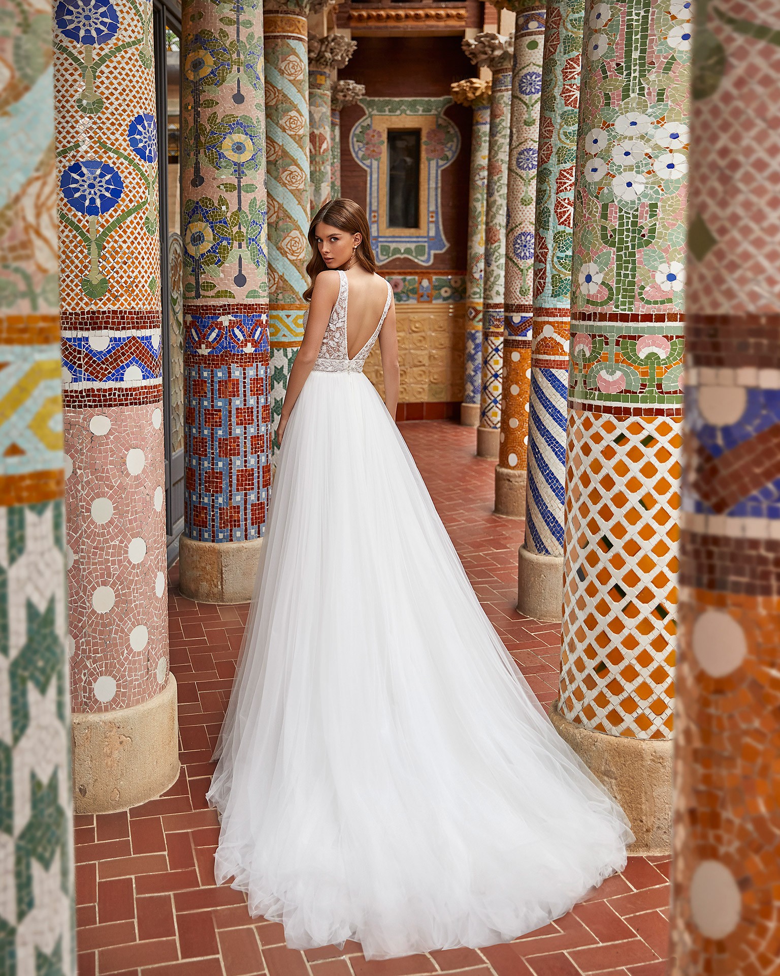 Le contraste entre le bustier entièrement perlé et le jupon simple en tulle très fin, fait de cette robe une pièce résolument moderne. C'est un modèle agréable à porter, idéal pour les mariage à la plage , ou dans un jardin. La quasi absence de traine est un atout pour ce deplacer lors de ce type de mariage.